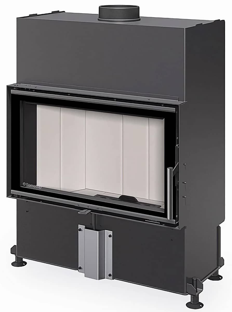Камінна повітряна екологічна топка Romotop Heat 4G 70.44.14 з відкриттям дверцят вбік, прямим склом і футеруванням зі світлого матеріалу Igniton.