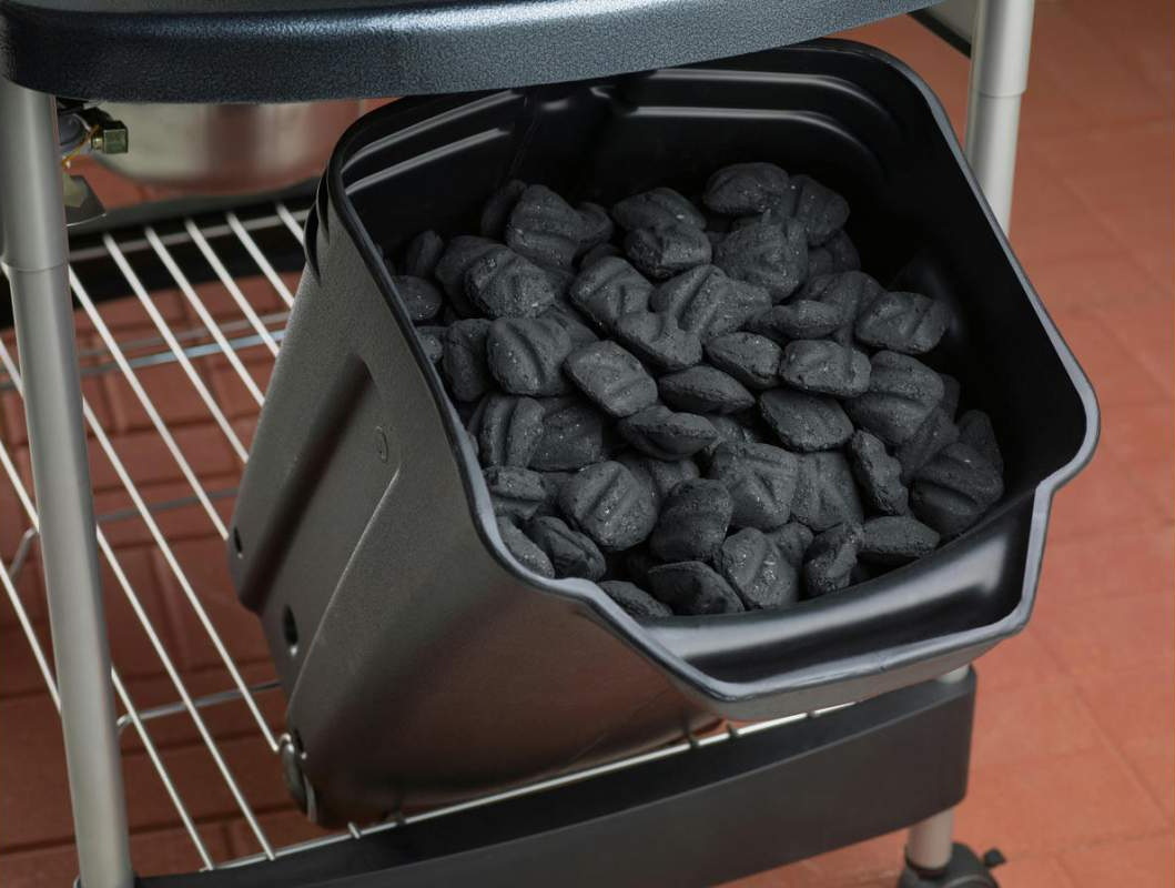 - Контейнер для зберігання вугілля не боїться дощу й сонця – паливо завжди сухе і під рукою;