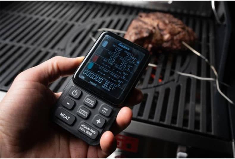 - Термометр не підходить для приготування на вертелі, оскільки провід може намотатися під час обертання. Однак ви легко можете використовувати його в точковому режимі, просто вставляючи щуп у м’ясо для швидкої перевірки температури – пристрій миттєво покаже результат.