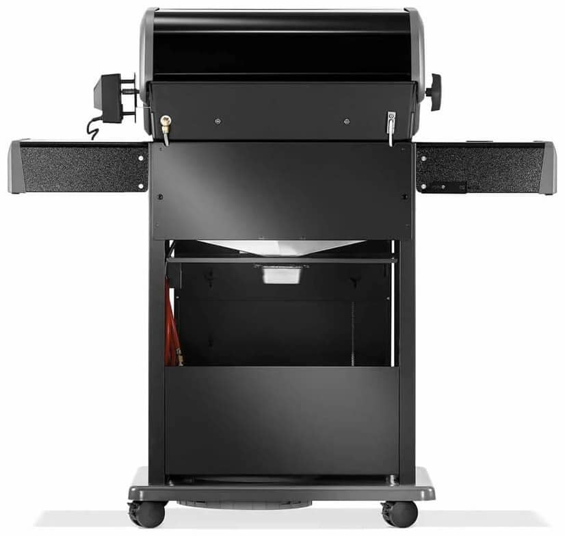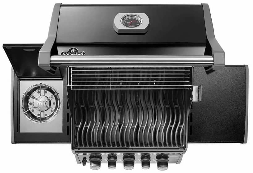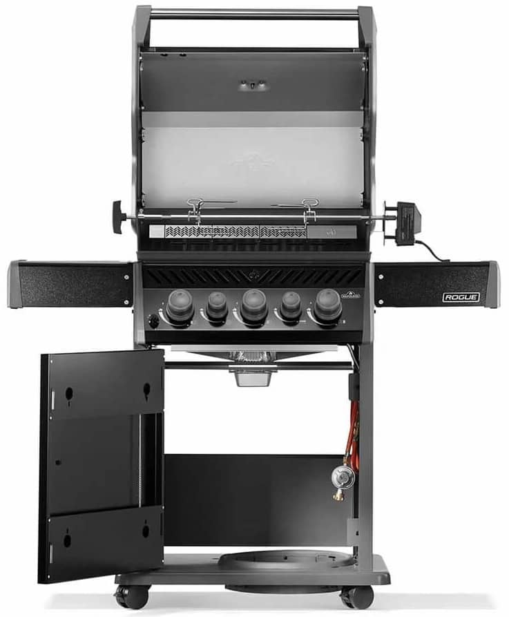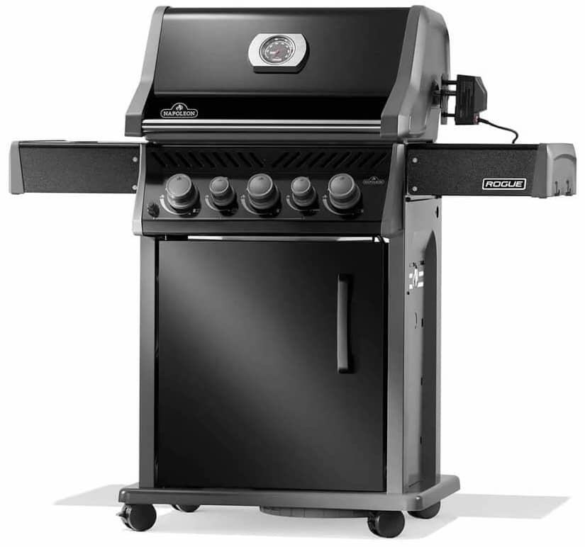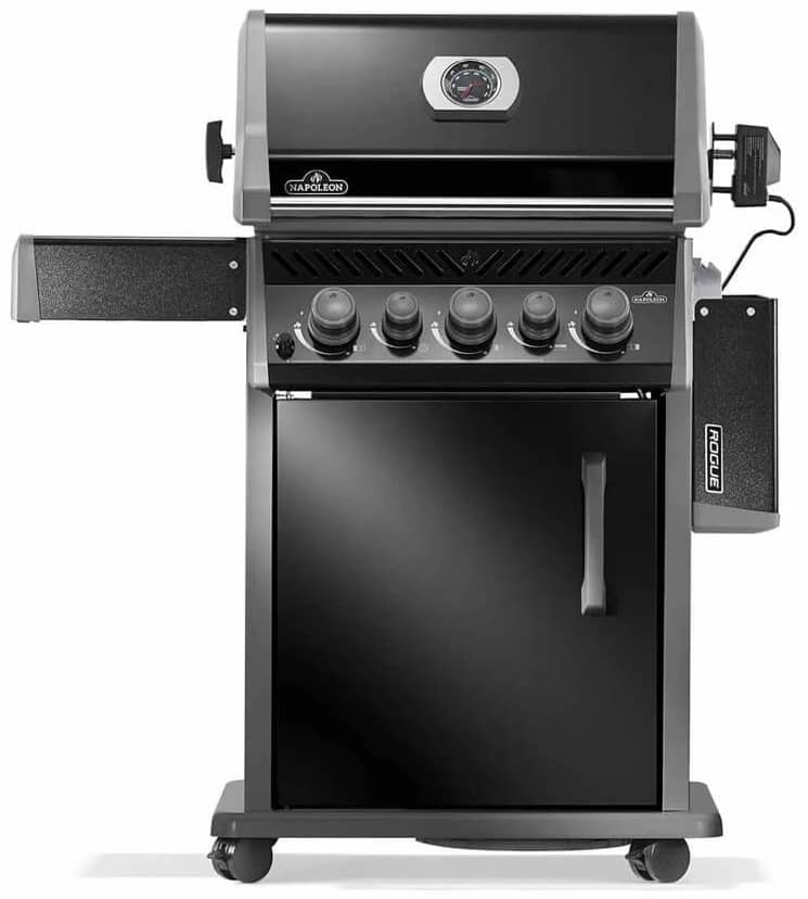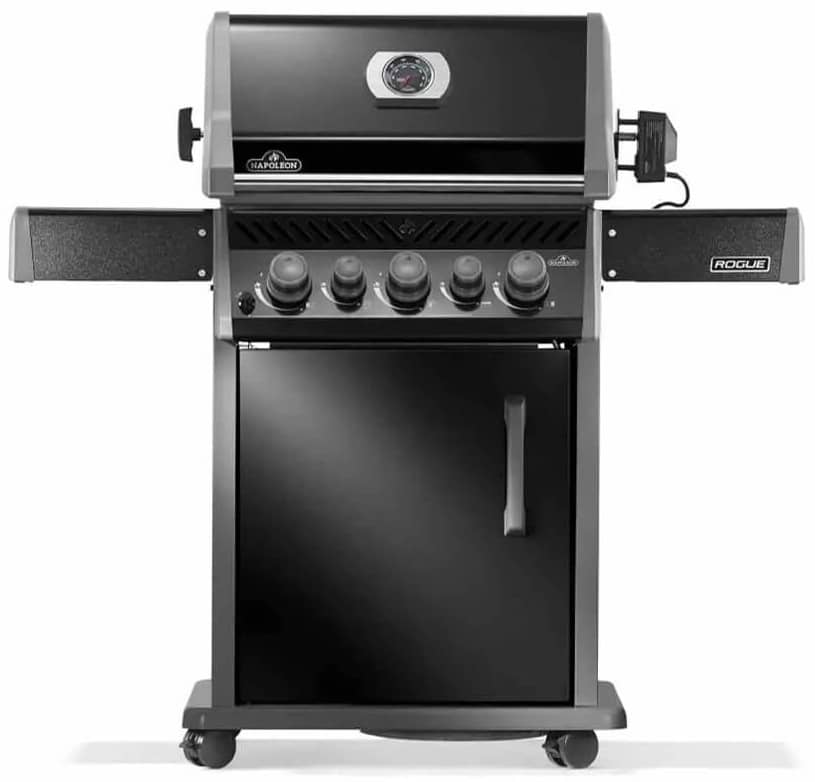 Мобільний газовий гриль Napoleon Rogue 425 в чорному виконанні, на 5 пальників, заднім пальником, додатковою бічною конфоркою, вертелом і вбудованим термометром.