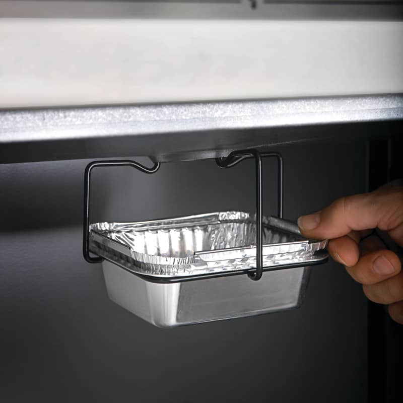- Піддони встановлюються у спеціальний відсік у нижній частині гриля та легко змінюються після заповнення;