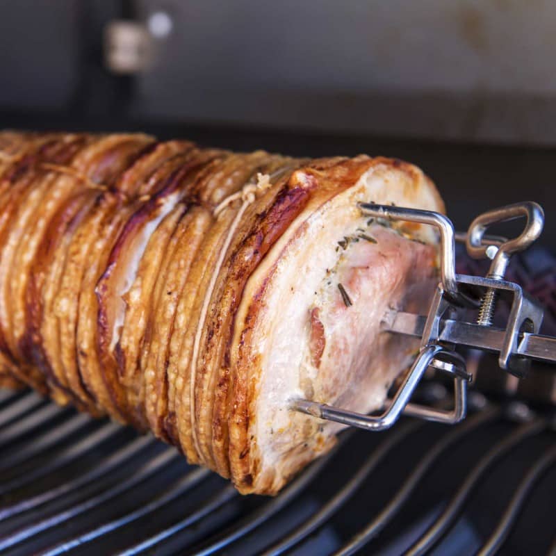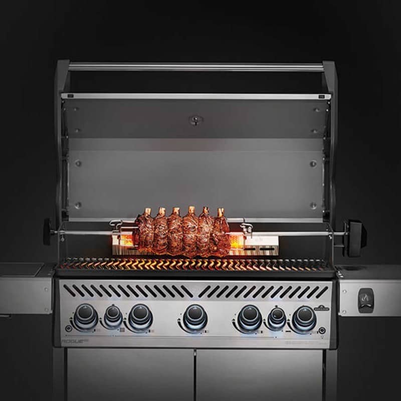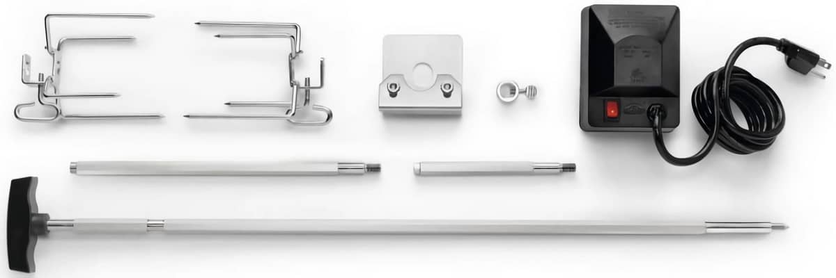 Рожен Napoleon із нержавіючої сталі, пластиковим приводом та двома фіксуючими вилками для газових грилів Rogue 365 / 425 / 525 / 625 – чудово підходить для запікання м’яса, птиці, овочів та інших улюблених страв із насиченим ароматом барбекю.