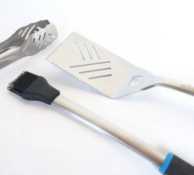 • До комплекту входять щипці, широка лопатка та кулінарний пензлик – усе необхідне для зручного перевертання, подачі та змащування продуктів під час смаження;
