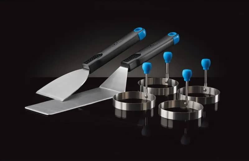 • У комплект входять 4 кільця для смаження яєць, зручна лопатка та скребок для очищення поверхні;