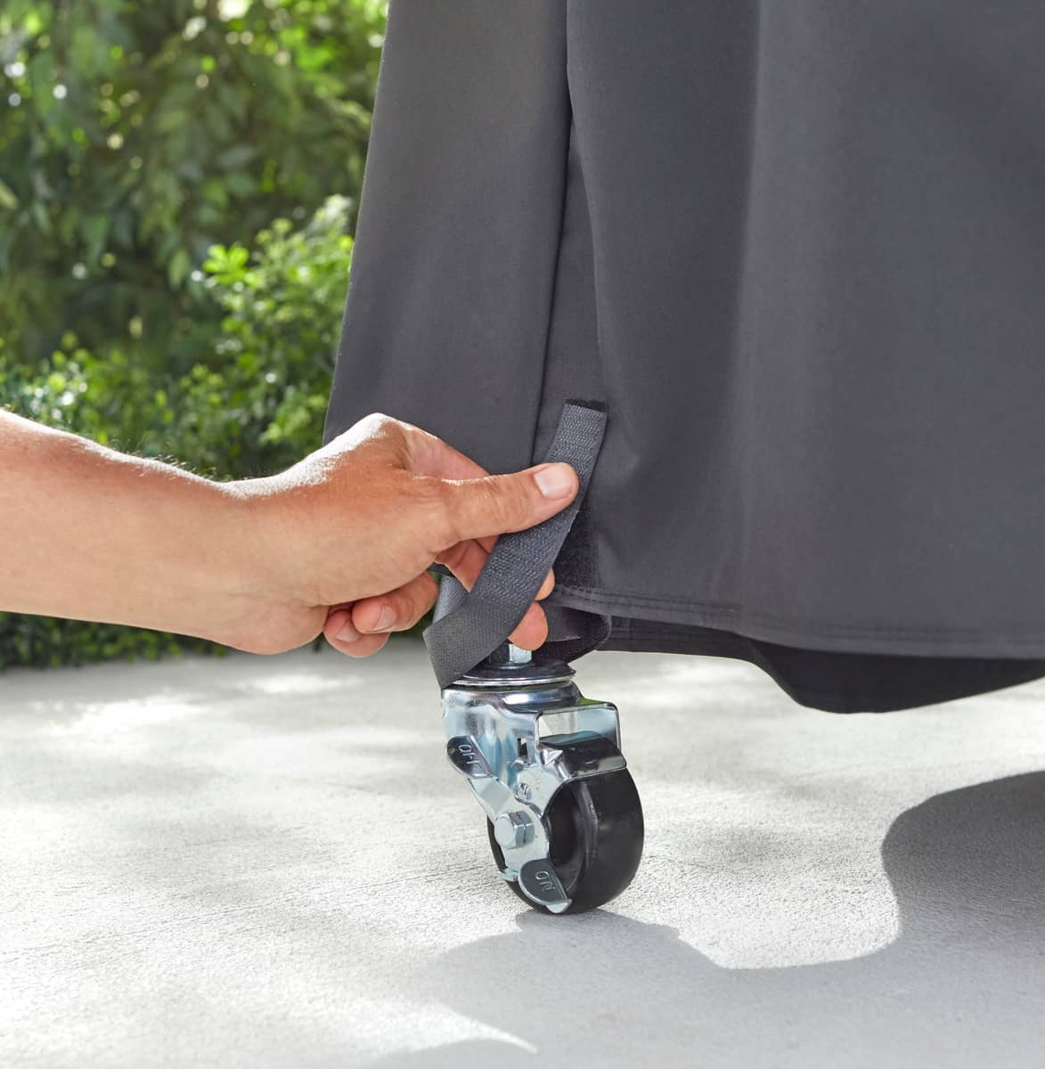 - Виготовлений із щільного, але повітропроникного поліестеру, чохол ефективно оберігає гриль від ультрафіолету, опадів і морозів;