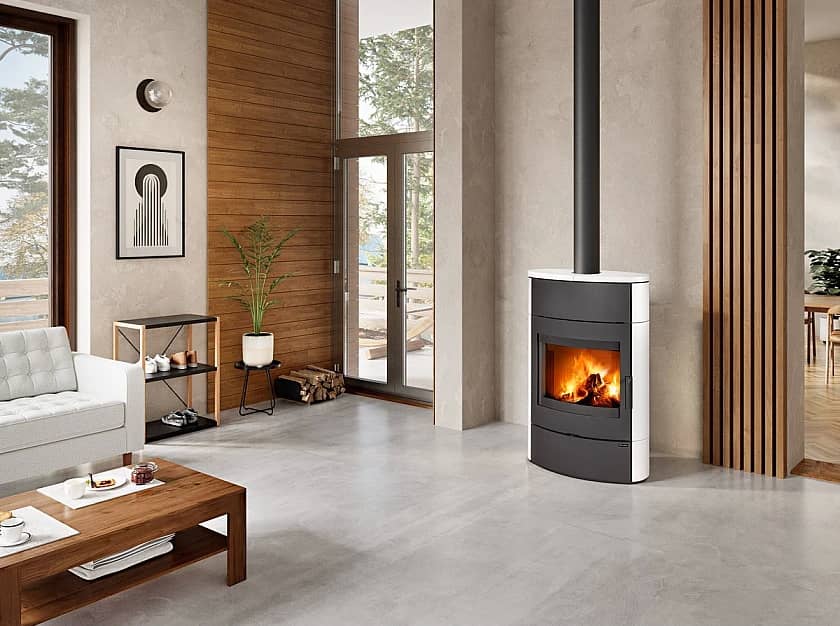 Акумуляційна дров’яна піч-камін Romotop Navia H 10 в керамічному облицюванні, панорамним склом і дровником.