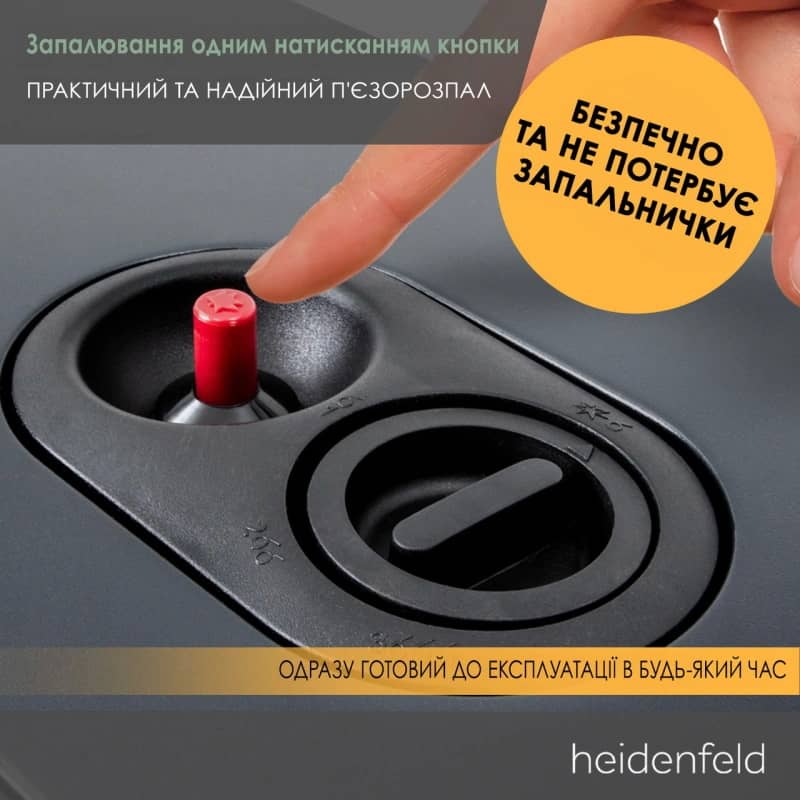 • Пристрій має зручний механічний п’єзопідпал, що дозволяє запускати пристрій без використання сірників або запальничок;